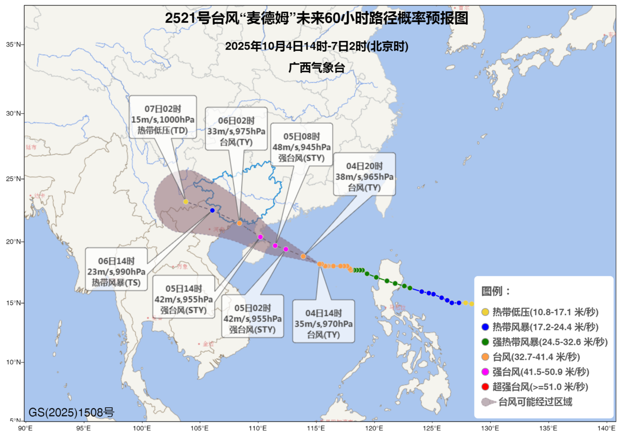 记者从广西气象台获悉,今年第21号台风“麦德姆”(台风级)10月4日14时中心位于广东省湛江市徐闻县东偏南方约590公里的南海北部海面上。预计,“麦德姆”将向西偏北方向移动,5日白天在广东电白至海南万宁一带沿海登陆,5日下午到夜间移入北部湾。受其影响,5-6日桂南、桂西和越南北部将有大雨到暴雨、局地大暴雨天气,累积雨量40~120毫米(崇左和越南北部80~110毫米)、局地200毫米以上,并伴有5~7级大风,阵风可达9~10级;北部湾海面最大风力8~11级、阵风12~13级。本次降水与前期强降水落区重叠,洪涝、中小河流洪水、地质灾害等发生风险高,同时目前正值国庆中秋假期,需加强做好防御台风各项工作。