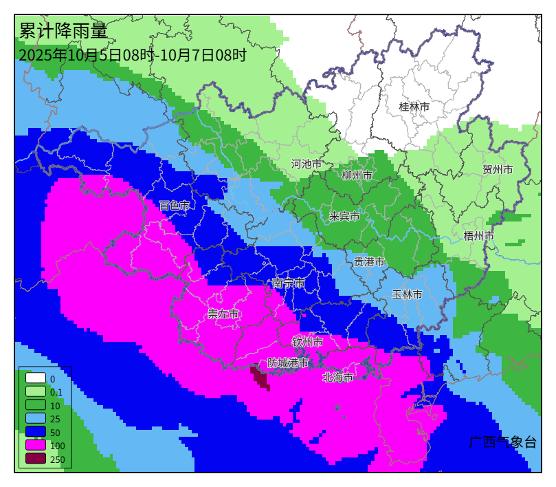 降水预报:10月5日8时至6日8时,海南岛大部、广东西南部、广西南部等地部分地区有暴雨到大暴雨,局地特大暴雨(250~320毫米)。