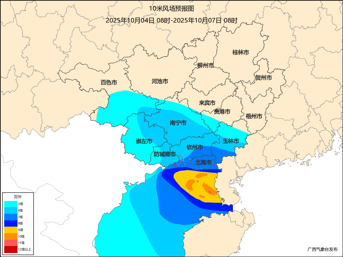大风预报:10月5日8时至6日8时,南海西北部和中西部海域、东沙群岛、西沙群岛、北部湾、琼州海峡、广西南部及沿海、广东南部及沿海、海南岛及沿海将有6~8级、阵风9~10级的大风,其中,南海西北部海域、琼州海峡、北部湾北部海域、广东雷州半岛及沿海、广西沿海、海南岛东部和北部沿海的风力有9~11级、阵风12~13级,部分海域或地区风力可达12~14级,阵风15~16级。
