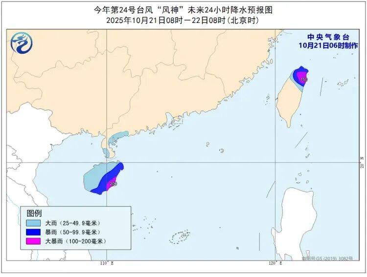 降水预报:21日08时至22日08时,广东西南部、海南岛、台湾岛北部等地有大到暴雨,海南岛东南部、台湾岛北部局地有大暴雨(100至200毫米)。