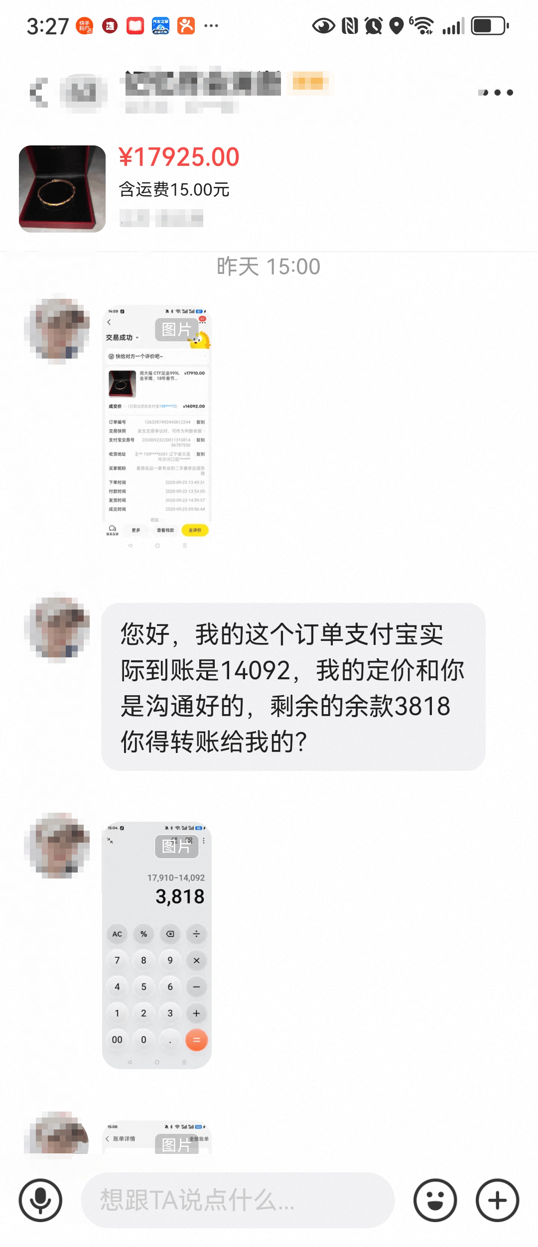 根据张先生提供的聊天记录,该笔交易涉及的是一只重35.82克的金手镯。卖家表示,她记得6年前交易完成后,订单显示的到账金额应为17910元,但近日再次打开二手交易平台查看时,却发现实际到账只有14092元,两者相差3818元,因此要求张先生补转余款。卖家在沟通中质疑:“我找你只是想拿到我应得的余款,你当时是用了什么手段,让原本该到账的17910元,变成了现在的14092元?”