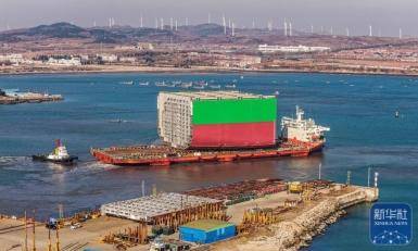 1月6日,在山东省荣成市俚岛镇三星重工业(荣成)有限公司港区,由韩国籍“卡罗湾”轮装运的大型液化天然气运输船船段顺利装船发往韩国。