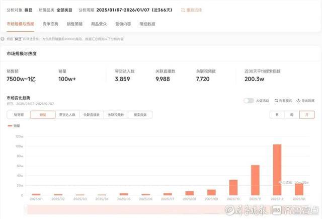 某电商平台发布的《2025年度十大商品》中,拼豆也名列其中,近一年搜索量同比增长近500%。某直播电商数据分析平台数据也显示,自2025年8月起,拼豆相关产品销量持续增长,近一年销售额已突破7500万元,累计销量超100万单。有机构预测,2026年拼豆市场规模有望接近10亿元。