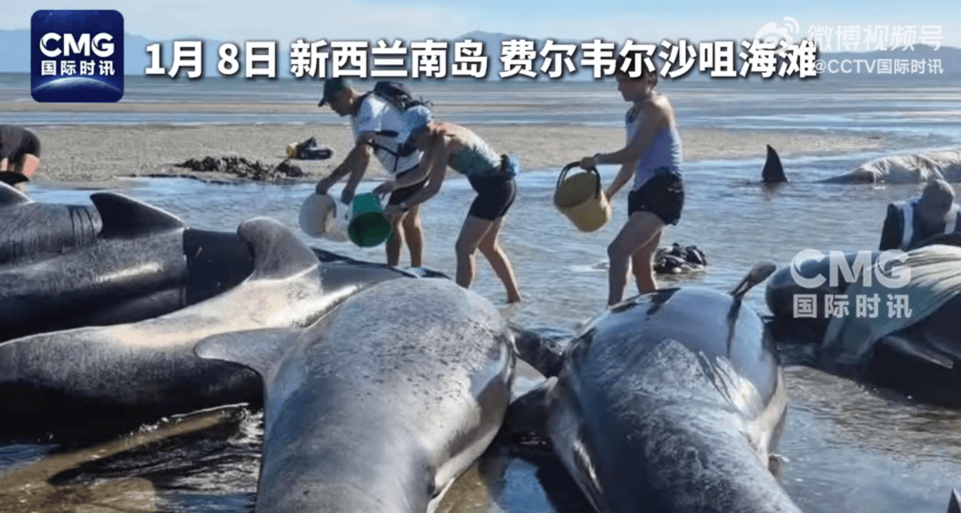 ● 近日,约55头领航鲸在新西兰南岛北端的一处沙滩搁浅,近200名救援人员迅速行动。