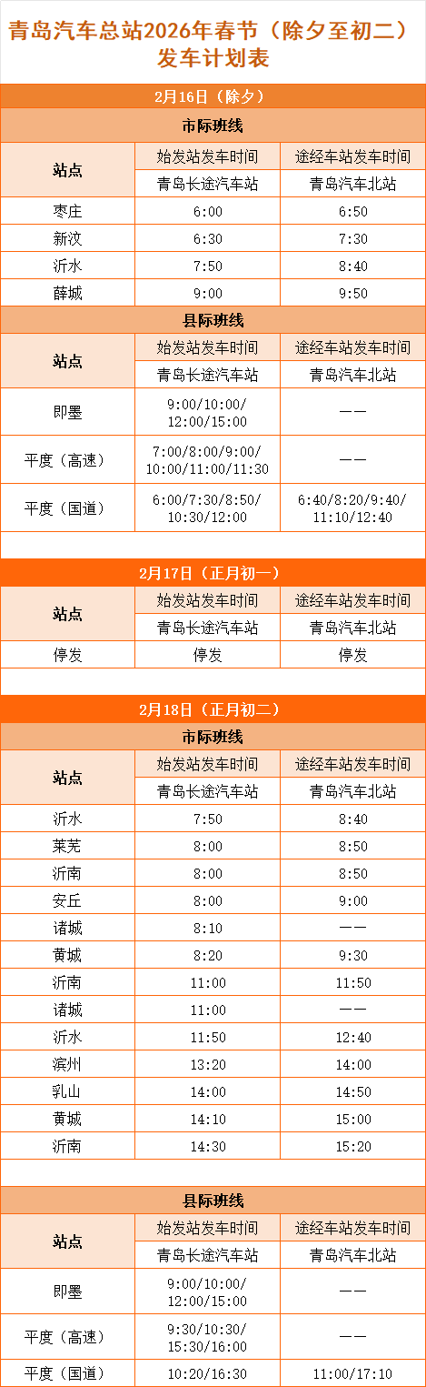 此外,2月9日起,旅客已经可以购节假期(2月15日-23日)往返程的汽车票,节后返程客流小高峰预计在2月23日(正月初七)及3月初返岗返校前后,广大旅客请提前规划行程及时关注票务信息与天气变化,建议通过官方渠道“城运控股交运汽车总站”或下载“交运行”APP尽早订票(乘车当日无需取票,凭乘车人身份证即可进站乘车)。附:青岛汽车总站2026年春节(除夕至初二)发车计划表。需要提醒的是,发车信息仅供参考,具体发车时间以车站当日调度信息为准。
