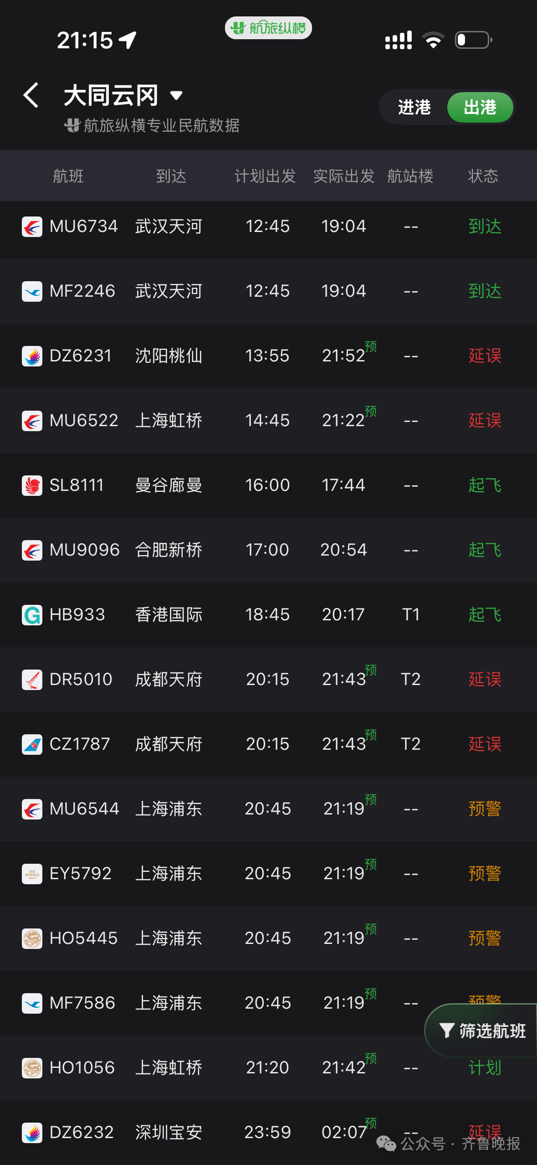 根据航旅纵横App显示的信息,山西大同云冈机场受到的影响则更为严重,21日白天的航班延误几乎都在七八个小时,白天的航班全部延误到晚上才出发。