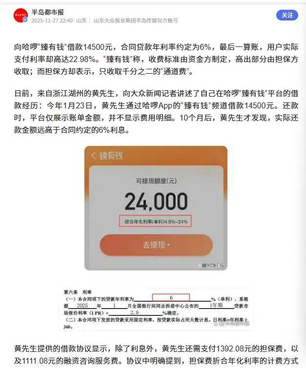 在半岛都市报《约定利率6%实际近23%!哈啰“臻有钱”真会赚钱!》的报道中,有消费者表示,哈啰旗下“臻有钱”平台借款年利率为6%,但除此之外,哈啰还收取担保费+融资咨询服务费,年化利率达到12.98%,三者合计达到22.98%。