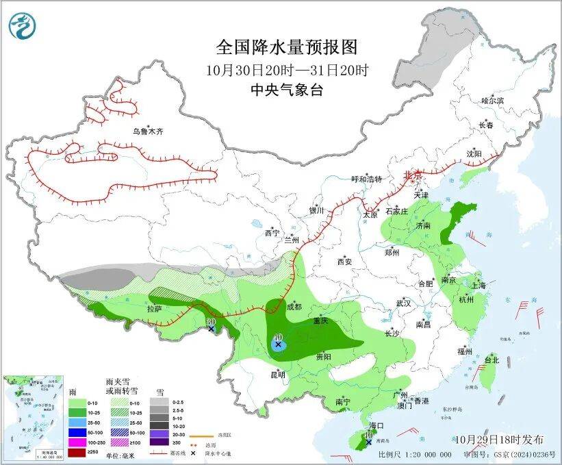 10月30日20时至31日20时,内蒙古东北部、黑龙江西北部、西藏中部、青海南部和川西高原北部等地部分地区有小到中雪或雨夹雪。辽东半岛、黄淮东部、江淮东部、江南东部和西部、西藏南部、西南地区大部和华南西部等地部分地区有小到中雨,其中,西藏东南部、四川南部、云南东北部和海南岛东部等地部分地区有大雨(25~40毫米)。