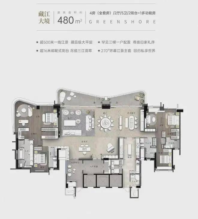 【湾流480㎡天幕揽江大平层 】 画江为界,跨越时代的岛尖藏品,4套房2厅5卫+1多功能房设计,4.0时代人居范本,重新定义珠江豪宅天花板。